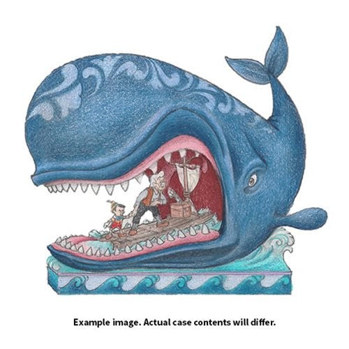 Holding his sons hand Geppetto calms Pinocchio's fears even in the mouth of a beast Monstro the giant whale looks absolutely terrifying in this Jim Shore figurine even when covered in ravishing rosemaling Unique variations should be expected as this product is hand painted Packed in a branded gift box Not a toy or children's product Intended for adults only.